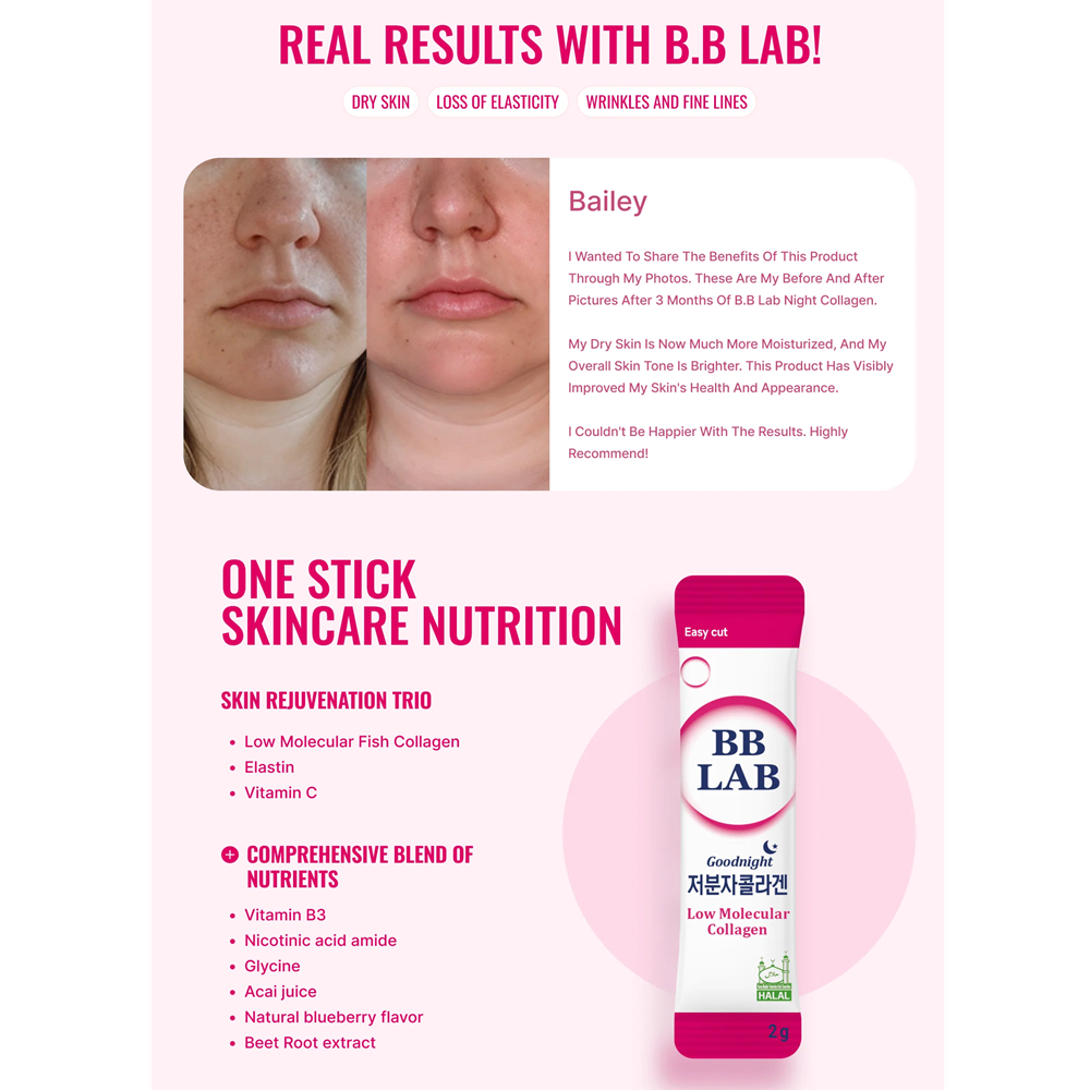 - فرمول حلال و وگان همراه با هیالورونیک ، ویتامین C، الاستین و پروبیوتیک در هر ساشه